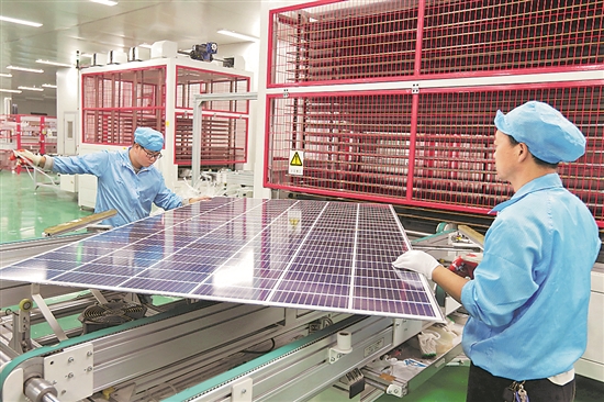 近年来,安徽省淮北市烈山区借助长三角一体化发展契机,积极建设产业承接平台,通过建设智能工厂,加大科技创新投入,引进光伏新能源企业入驻,促进光伏产业快速发展,助力区域经济转型升级。目前,当地生产的光伏面板产品除供应国内市场外,还出口日本、荷兰、西班牙、澳大利亚等国家。新华社发(万善朝 摄)