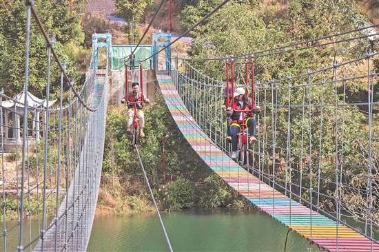 11月23日,云南省文山州西畴县,游客在香坪山体验空中自行车。