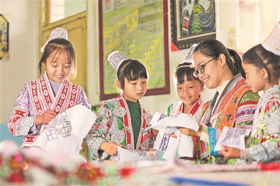 近年来,折溪小学积极推动“指尖技艺”刺绣进课堂,学校精通刺绣、蜡画、蜡染的教师指导学生学习,让苗族孩子们“零距离”接触非遗技艺,弘扬和传承民族优秀传统文化。