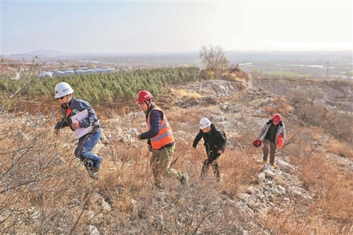 天津华北地质勘查局地灾防治工作组成员在天津市蓟州区一座废弃矿山上实地踏勘。