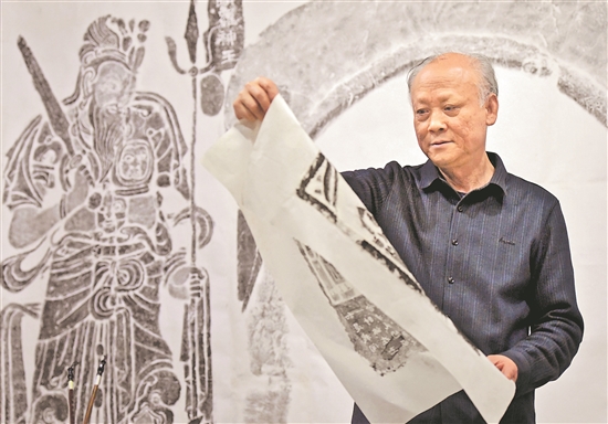 在位于河南省郑州市金水区文化馆的工作室里,李仁清查看完成后的拓印作品(11月16日摄)。