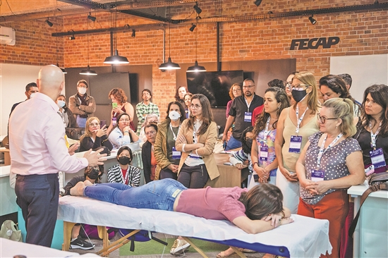 当地时间11月26日,在巴西圣保罗举行的世界中医药大会上,一名中医为嘉宾讲解中医正骨手法。第十九届世界中医药大会26日在巴西圣保罗开幕。此次会议是世界中医药大会第一次走入南美洲。
