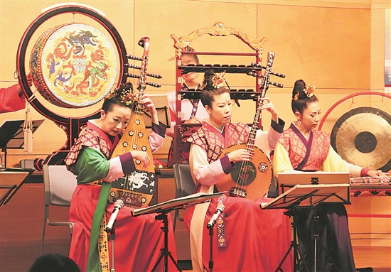 “此曲只应天上有,人间能得几回闻。”身着唐装的乐人演奏横笛、排箫等十多种唐代乐器,华丽炫目的螺钿紫檀五弦琵琶展现在观众眼前,跨越千年的美妙乐曲在日本奈良奏响。