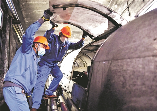 图为11月12日,燃料车间职工周茂升(左)和李大万检查输煤皮带运转情况。苏成武 摄