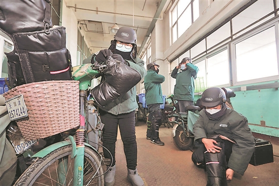 连日来,气温骤降,天津市邮政公司工会启动慰问工作,通过前期精准调研让职工选择需求的防寒物品,让穿梭于大街小巷、田间地头的邮政揽投员感受到工会组织的关爱。图为11月29日位于天津东站的邮递员正在戴上工会送来的护膝、头盔、防风套等物资。本报通讯员 沈岳 摄