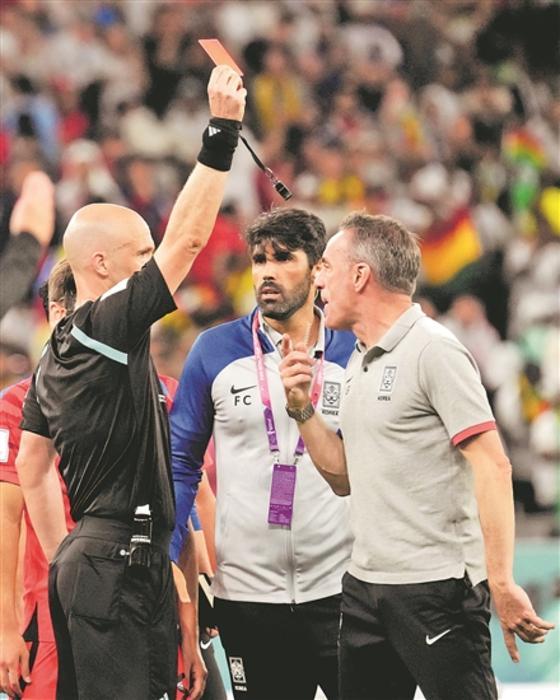 当地时间11月28日,主裁判安东尼·泰勒(左)向韩国队主教练保罗·本托(右)出示红牌。
