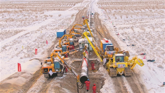 11月30日,甘肃酒泉,中国石化石油工程建设公司江苏油建西气东输四线天然气管道工程(吐鲁番-中卫)项目线路工程施工第五标段(甘肃酒泉)施工人员顶风冒雪进行安全施工,目前,施工进度按照施工计划科学有效向前推进。