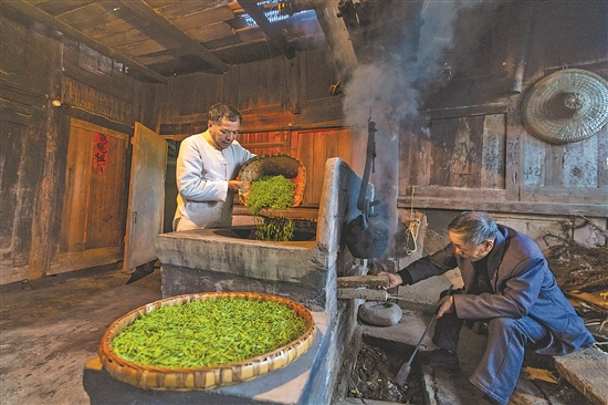 在四川省雅安市名山区的张氏祖屋,张跃华(左)用传统的“红锅杀青”方式对摊晾后的鲜叶进行杀青(2022年3月31日摄)。