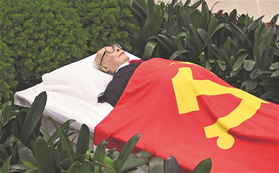 12月5日,江泽民同志的遗体安卧在鲜花翠柏丛中,身上覆盖着鲜红的中国共产党党旗。新华社记者 谢环驰 摄