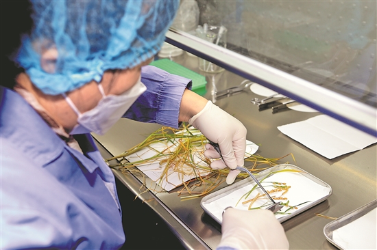 12月5日,在中科院空间应用中心生物实验室,中科院分子植物科学卓越创新中心郑慧琼研究员处理从太空归来的水稻样品。