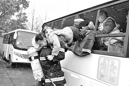 图为校车跟车教师与交警、消防一起协助,演练从窗口紧急疏散学生。演练有效加强校车安全管理,提高了乘车学生的交通安全意识和应急防范能力。