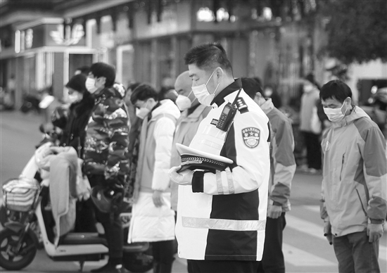 这是在江苏省扬州市街头,群众肃立默哀。新华社发(孟德龙 摄)