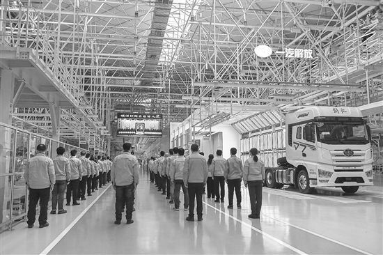 这是在吉林长春的一汽解放工厂车间,工人们收看江泽民同志追悼大会直播。新华社记者 张楠 摄