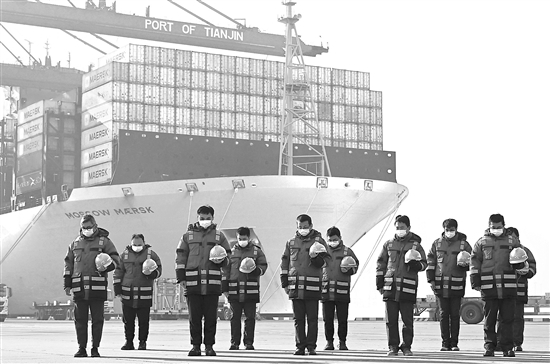 这是在天津港太平洋国际集装箱码头,职工肃立默哀。新华社记者 赵子硕 摄