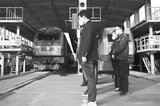 这是在中国铁路兰州局集团有限公司兰州西机务段东整备车间,机车鸣笛,干部职工肃立默哀。新华社记者 陈斌 摄