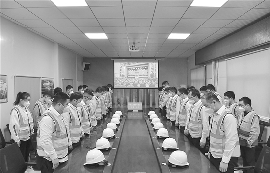 这是在河南郑州中原数字产业园(西园)项目工地,中建三局的建设者肃立默哀。