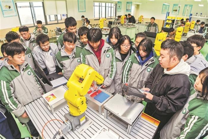 12月6日,在浙江省瑞安市瑞立职业技术学校,来自四川省南部县脱贫户家庭的孩子们正在教室学习机械手臂操作。南部县与瑞安市瑞立集团签订东西部协作培养“骄傲蓝”项目,通过职业技术学校培养、技能提升培训等方式,为两地培养一批汽摩配产业高技能技术人才、精英蓝领。孙凛 摄/人民图片