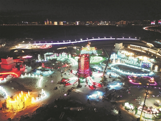 目前,哈尔滨冰雪大世界正在火热建设中。预计用冰量10万立方米、用雪量5万立方米的第24届哈尔滨冰雪大世界,将为游客打造“冰雪童话王国”。图为施工人员在哈尔滨冰雪大世界园区施工作业(无人机照片)。