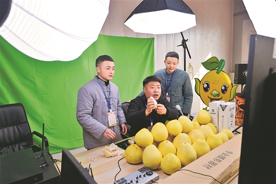 12月12日,网络主播在湖北省恩施土家族苗族自治州宣恩县沙道沟镇栏杆坪村参加贡水白柚线上直播销售擂台赛。眼下,宣恩县特产、国家地理标志产品贡水白柚成熟上市。当地邀请网络主播举办线上直播销售擂台赛,助力贡水白柚外销。