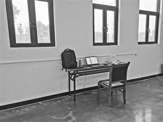 在重庆潼南区方舱医院,李峥找了个相对安静的地方给学生上网课。受访者供图