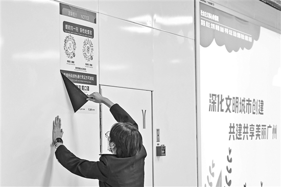 12月7日晚,广州,地铁工作人员撤除体育西地铁站入站口的健康码扫码指引。视觉中国 陈骥旻 摄
