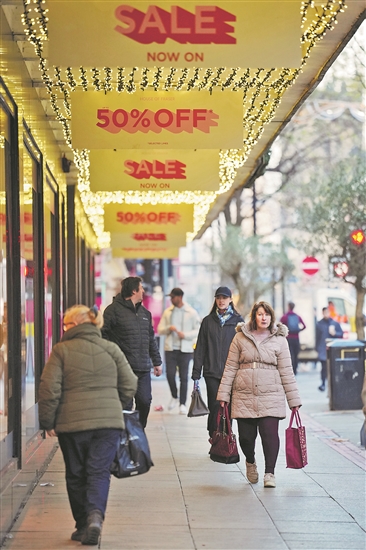 12月13日,人们走过英国曼彻斯特街上的促销广告。