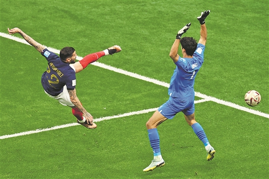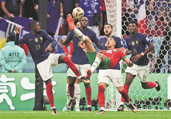 当日,在卡塔尔豪尔海湾球场进行的2022卡塔尔世界杯足球赛半决赛中,法国队对阵摩洛哥队。