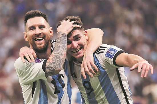 当地时间12月13日,阿根廷队球员阿尔瓦雷斯(右)在比赛中进球后与队友梅西庆祝。