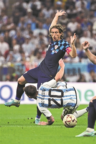 当地时间12月13日,克罗地亚队球员莫德里奇(上)与阿根廷队球员麦卡利斯特在比赛中拼抢。