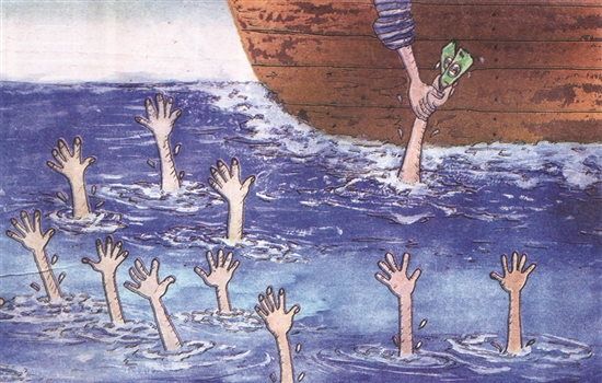 水上传来遇险人的呼救声,此时舟楫出现了,它摆出救人施善的架势,可恨船上这些图财害命的家伙只向“钱”伸手。