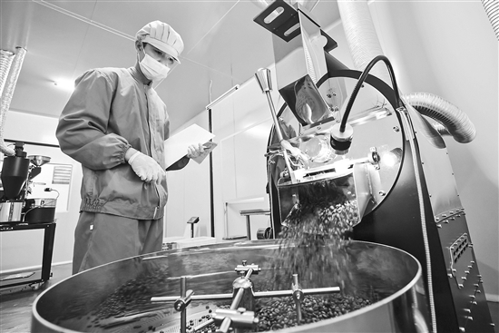 近日,在位于海南澄迈的才存咖啡厂,返乡大学生徐宝在烘焙咖啡。