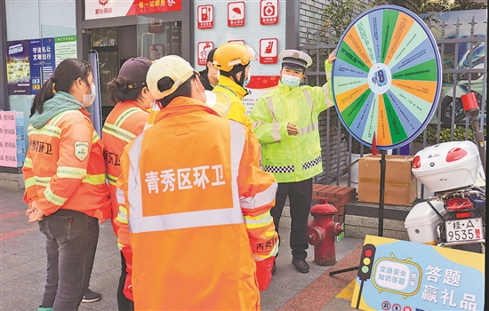 12月21日,广西壮族自治区南宁市的环卫工等户外职工在“一岗一驿站”参加开放日活动。今年6月,自治区总工会、南宁市总工会、市交警支队等单位开始探索户外劳动者服务站联建共享新模式,并设立“党员先锋岗·工会爱心驿站”,服务交通干警和新就业形态劳动者等。