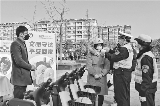 近日,安徽金寨县交警联合共享电动自行车企业开展安全宣传活动,旨在提升市民骑行电动自行车时的风险意识。在金寨县运营的共享电动自行车目前已全部配备蓝牙设备,如用户没有正确佩戴头盔,则车辆无法正常启动。图为12月18日,交警和志愿者为用户佩戴“智能头盔”并讲解其使用方法。闫宏 摄