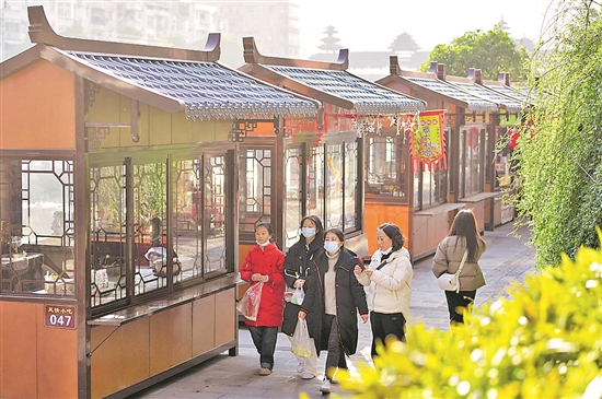 近日,湖北省恩施土家族苗族自治州宣恩县城区新建的100余间“地摊小屋”陆续投入使用,成为一道融入城市的风景。该县在进行县城建设和老旧小区改造过程中,结合民族建筑风格设计浓厚乡土气息的“地摊小屋”。新华社发 (宋文 摄)