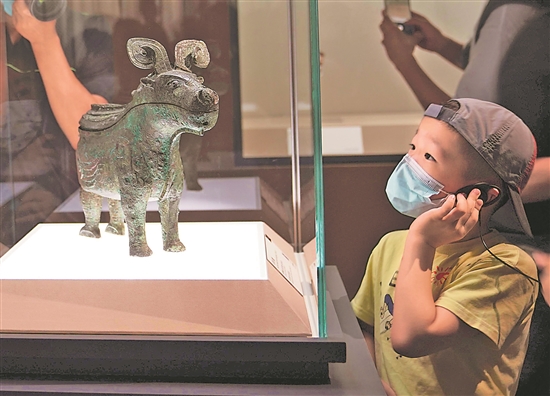 2022年7月30日,小观众在上海博物馆举行的“宅兹中国——河南夏商周三代文明展”上参观。