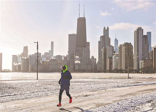 芝加哥近日遭遇严寒天气。图为当地时间12月24日,一名男子冒着严寒在美国芝加哥密歇根湖畔跑步。