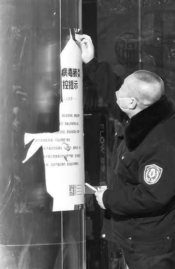 12月19日,北京,一名保安正在撕掉疫情防控提示。人民视觉 供图