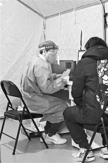 北京多区在体育馆开设了发热门诊。图为一名医生在简易诊室里问诊。本报记者 王伟伟 摄