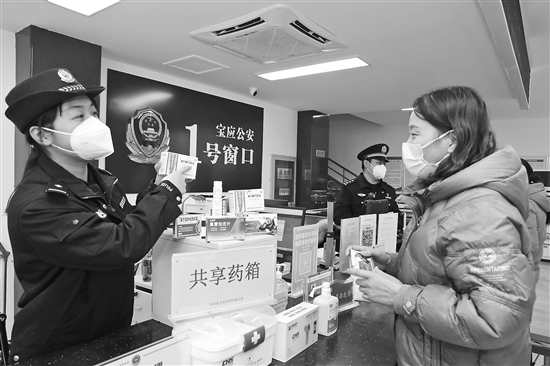 12月27日,江苏省宝应县公安局泾河派出所民警在“公安1号窗口”指导群众健康用药常识。连日来,宝应县公安局在各基层为民服务中心的“公安1号窗口”设置“共享药箱”,并号召广大党员民警、辅警及家属参与,将余药捐赠至“爱心共享药箱”,分享给有需要的群众。视觉中国 供图
