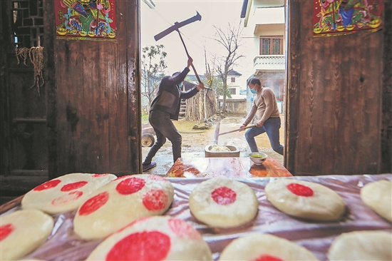 12月27日,岑巩县水尾镇马家寨村村民在打糍粑。