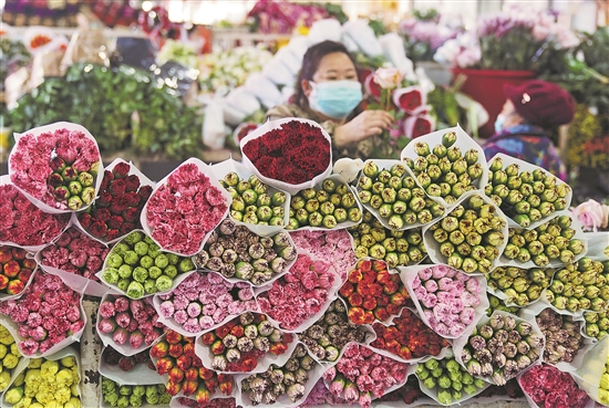 新年临近,各地的花卉基地和花卉市场繁忙起来,工作人员忙着管护、外运、销售花卉,供应节日市场。