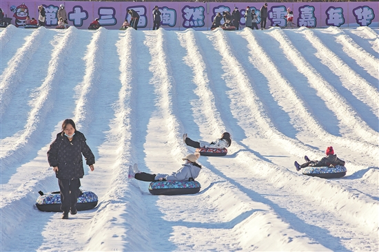 2022年12月28日,北京陶然亭公园内,市民正在雪地里游玩。新年即将到来,为让广大市民游客更好地享受冰雪运动、感受快乐健身的乐趣,颐和园、北海公园、陶然亭公园、紫竹院公园及玉渊潭公园5家北京市属公园举办冰雪游园会。本届游园会共开放7处自然冰场、3处人工雪场,总面积近50万平方米。