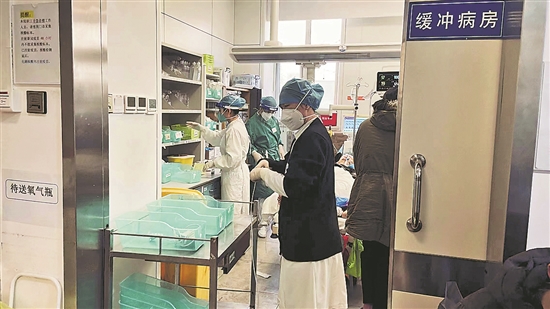 “急诊量每天在涨,70%是65岁以上的老年人,很多为重症患者,发热、胸闷、咳嗽,而且基本是低氧状态。”急诊科护士长孙红经历过非典(SARS),不禁对记者感叹道:“我们那边使劲地收,这边不断地来。”