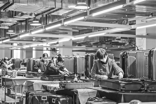 2022年12月29日,湖南省永州市蓝山县皮具箱包科技产业园内,工人们正开足马力赶制发往海外市场的箱包订单。近年来,蓝山县不断培育和扩大皮具箱包玩具、轻纺制鞋“一主一特”产业项目,铸强当地工业引擎,通过完善园区设施,优化营商环境,加快技术创新和人才引进,提升产品竞争力,助力企业拓展内外销市场。彭华 摄/人民图片