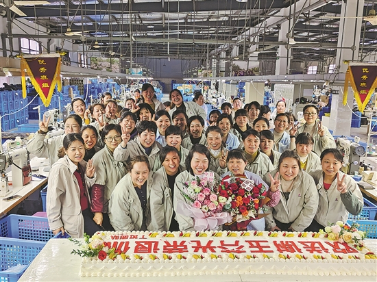 2022年11月16日,淮安华顶鞋业有限公司缝制车间机工谢玉芬在车间迎来盛大的生日会。王忠 摄
