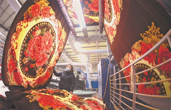1月3日,位于江苏连云港高新区海州工业园内的一家毛毯公司,工人正在毛毯生产线上忙碌。