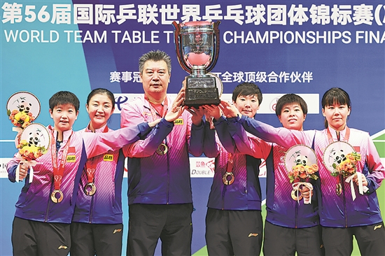 图为刚刚当选为国乒总教练的李隼(左三)在2022年成都世乒赛颁奖典礼上与选手孙颖莎(左一)、陈梦(左二)、王曼昱(右三)、王艺迪(右二)、陈幸同捧起世界乒乓球女子团体锦标赛冠军奖杯——考比伦杯。 新华社记者 刘续 摄