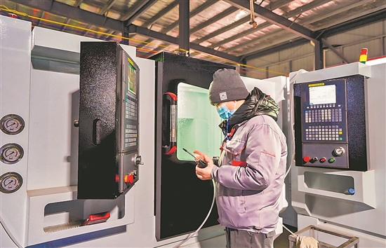 1月4日,在四川省会东县小岔河特色产业园区一家汽车零部件企业的生产车间,一名移民群众在工作中。