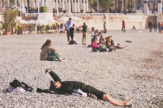 当地时间1月3日,人们在法国南部城市尼斯的海边休闲。新年初始,欧洲多地迎来反常高温天气。