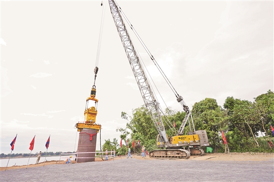 这是近日在柬埔寨桔井市拍摄的中企承建大桥工地。新华社发(万坡 摄)